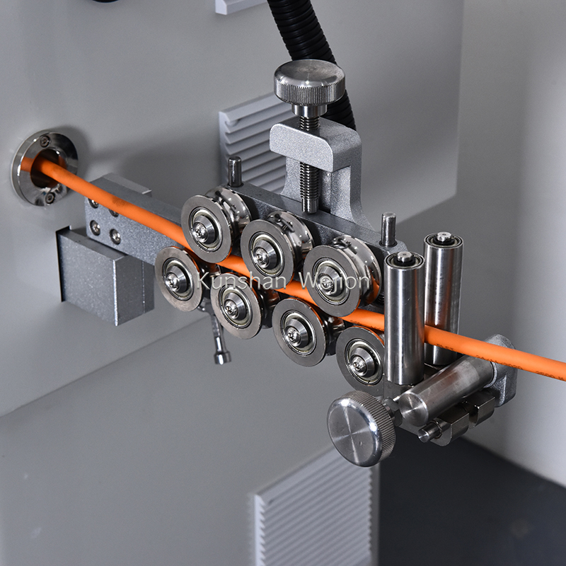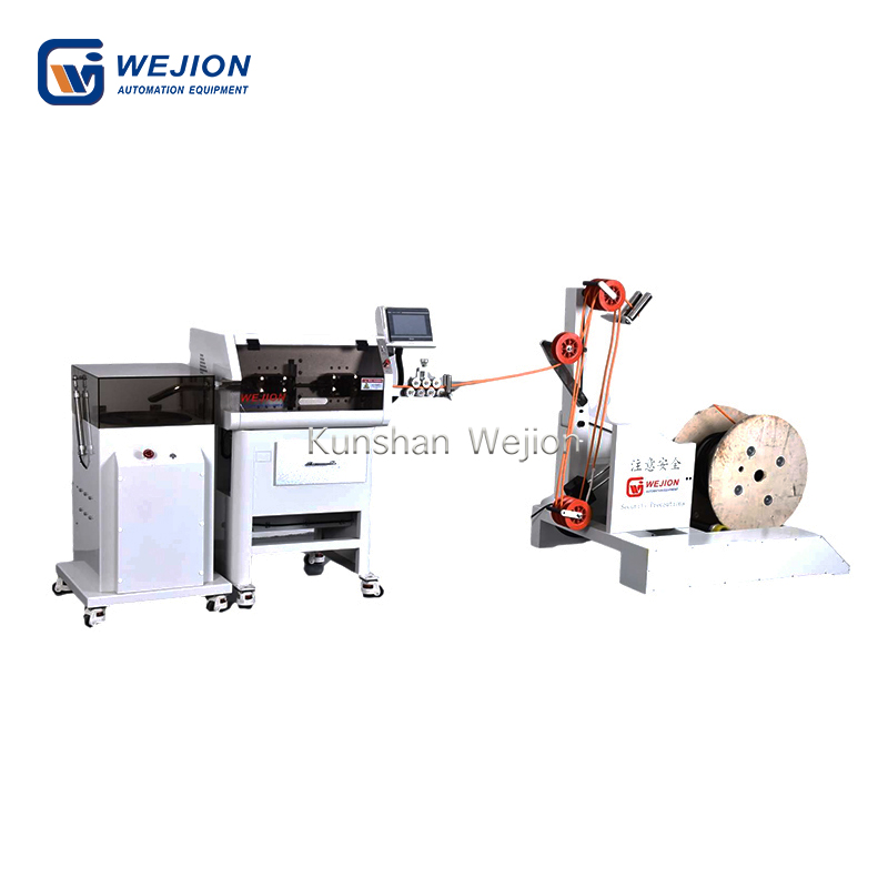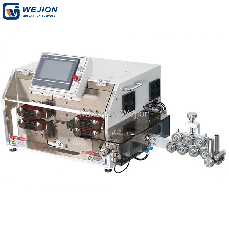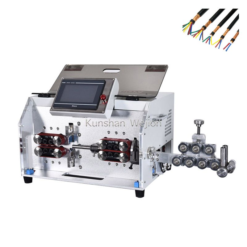 自动剥线机采用先进的驱动及运动控制算法,能有效地提升运动末端的定位精度和重复精度,整机完全采用计算机控制,通过按键可直接数字输入,全部工艺参数可由客户自行设置,以适应各种规格的电线电缆的切断剥皮。电脑控制、按键操作。性能稳定,低噪音。把整卷电线按照所需要的长度、剥头进行切好剥好。高速、精密驱动,采用步进驱动控制器,伺服刀架。特点:针对汽车行业、电力行业、电控柜、电池盒的线BV硬线,BVR软线电源线及套管等剪切功能。