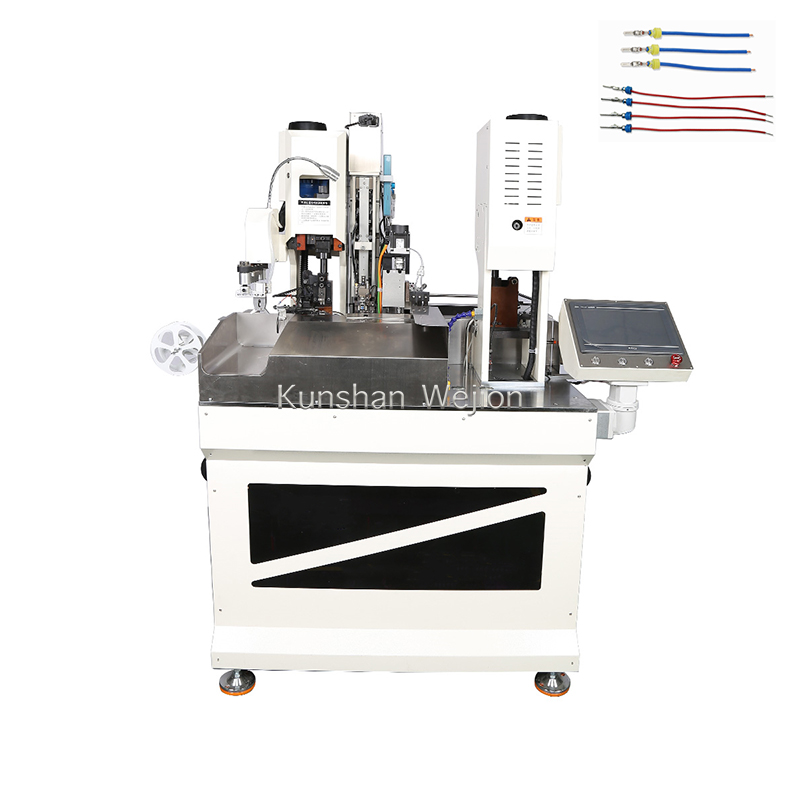1.本机为全自动沾锡穿防水栓端子机,一头剥皮上锡,另一头剥皮穿防水栓打端子。整机采用伺服电机驱动,包括端子压接