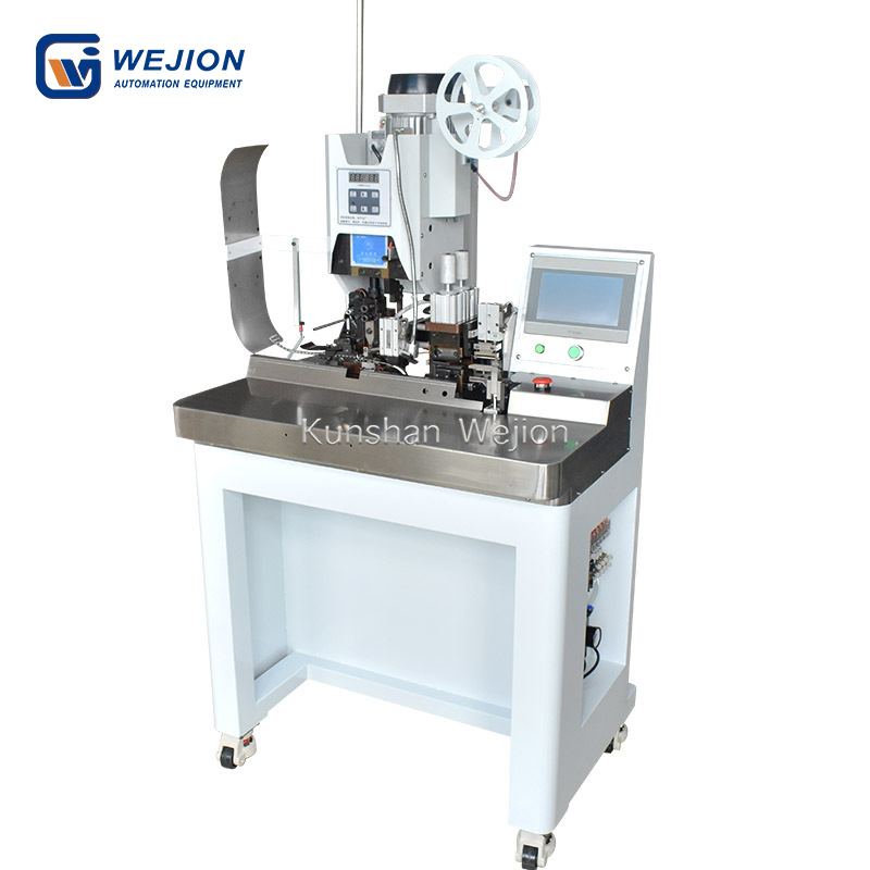 设备构成采用进口原件:伺服电机、SMC气缸、 日本三菱PLC、 日本小金井电磁阀等.人工放线,伺服自动送线,自动定位,自动压着。电脑触摸屏中文操作,易学,易用。采用伺服电机自动感应送料,压接更精准,生熟手均可操作,效率高,8000~ 10000PCS端子每小时调机采用触摸屏全自动智能化端子机采购超静音环保节能型,低损耗,
