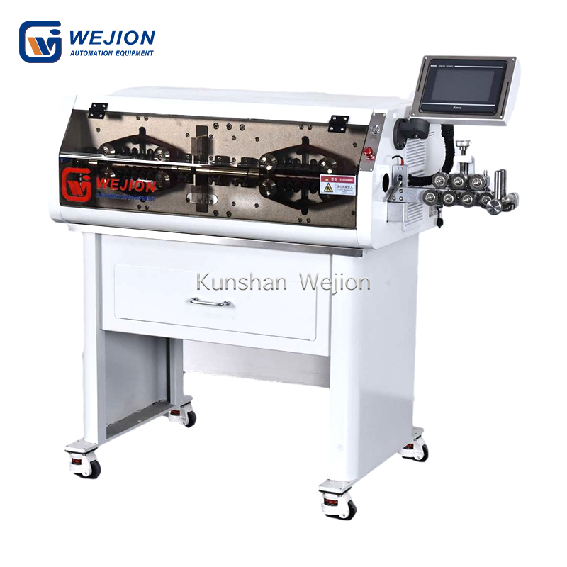 本机适用于加工4~ 150mm2的电缆线,双刀设计,切断刀与剥皮刀分开既有利于提升剥口的平整度也有利于提高切断刀的使用寿命。皮带送料机构可有效防止线材打滑,提高了送线精度,线皮表面无压痕。本机可选配自动收线机和喷码机,收线机主要用于加工长线,可将线材整齐的放入收料盘中;