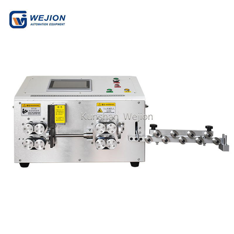 2、进、出轮的压紧力可直接在程序中设定,无需手动调节轮的压力。出线轮还具有自动升降功能。出线轮可自动抬起,避免剥线。因此,大大增加了线头的剥线长度范围。出料轮的提升高度也可以在程序中直接设置。