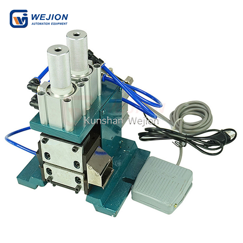 4. 另有双刀设计,剥皮与切断一次成型,增减垫片以定长度、准确、迅速,吹气装置可自动清除剥皮后所遗留之线屑。