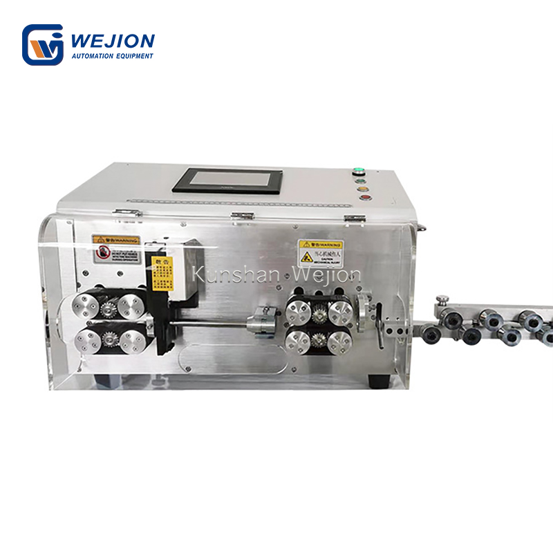 2、进、出轮的压紧力可直接在程序中设定,无需手动调节轮的压力。出线轮还具有自动升降功能。出线轮可自动抬起,避免剥线。因此,大大增加了线头的剥线长度范围。出料轮的提升高度也可以在程序中直接设置。